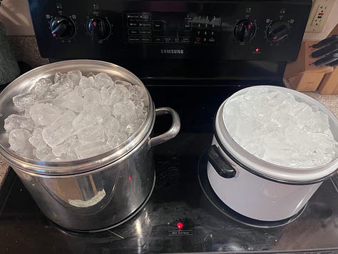 Let it go for 20–30 minutes, then turn off the heat and let it cool. You may need to drain off melted water from the lid and add more ice partway through.